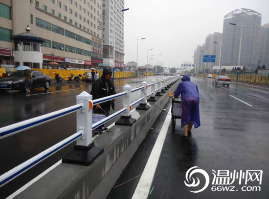 7月3日,下着雨,温州大道(车站大道-温瑞大道段)东西两侧,黄色塑料隔离设施在“把守”。