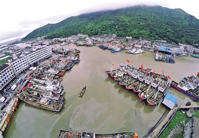 昨天,在苍南县龙港舥艚社区渔港码头,渔船陆续归港避风。 苏巧将 摄