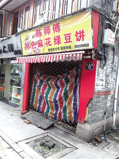 市区登选坊商铺林立,人头攒动,然而这条小街巷的一角,有一间糕饼店大门紧闭。只见头顶的广告牌上写着“陈师傅特色麻花绿豆饼”,可是店铺却早已经人去楼空。