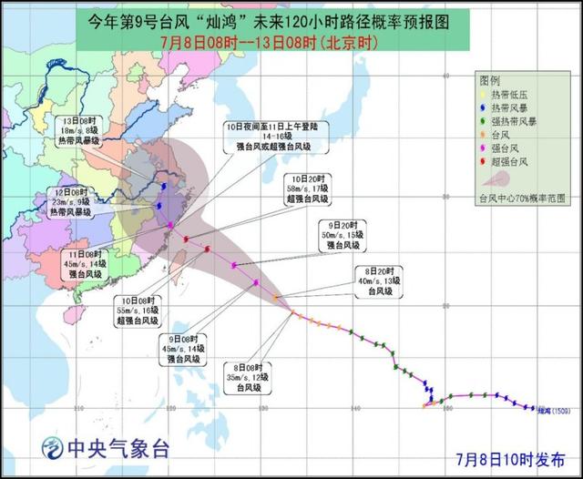 中央气象台预计,“灿鸿”将于10日白天进入东海东南部海面,最强可达超强台风级(16-17级,52-58米/秒) ,然后逐渐向浙闽一带沿海靠近,并有可能于10日夜间至11日上午登陆上述沿海地区,登陆强度可达强台风级或超强台风级(14-16级,45-52米/秒)。