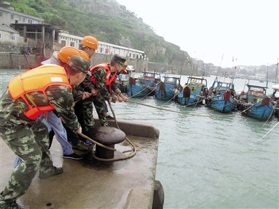 瑞安市北麂岛边防官兵在避风港帮助渔民加固渔船,积极做好抗台预防工作。 温州边防支队提供
