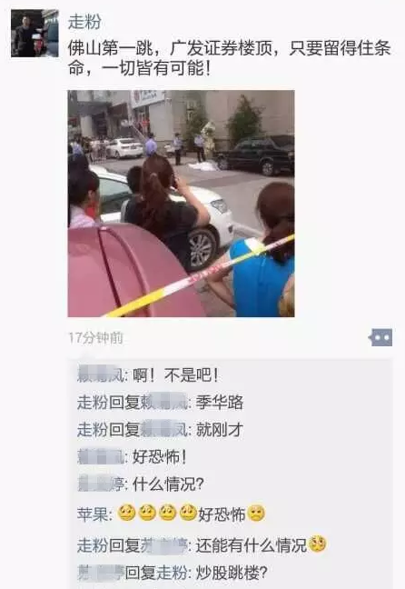 7月3日,一则“禅城季华路广发银行有人因炒股跳楼?”的消息在朋友圈广泛流传。这条微信配了一张跳楼图片,文字为:“佛山第一跳,广发证券楼顶,只要留得住条命,一切皆有可能!”配合近期的股市“跌跌不休”的行情,一经网上发酵,便形成病毒式传播。