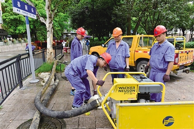 昨天下午,温州市排水有限公司出动了所有一线工作人员和车辆,在市区各个桥洞、隧道以及低洼地带部署排涝设备。图为他们在市区华盖隧道口准备排涝工作。 杨冰杰 摄