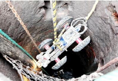 笔者当日在现场看到,坐在维修车上的一名工作人员用一台影像设备控制整体,另一名工作人员转动轱辘,将设备与机器人连接的电线一点点放出。又有一工作人员将一长约80厘米、底部有四个轮子的小机器人放在窨井管道口后,它便向管道深处慢慢爬进。
