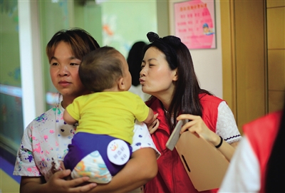 在筛查前,志愿者不停安抚小朋友的情绪。 刘伟 摄
