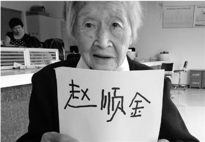 昨天,我让老太太写自己的名字,100岁的老人家认认真真地把“赵顺金”三个字写了出来。“金”字里的一小撇和一小捺,老太太写成了两个圆圆的点点,很可爱。