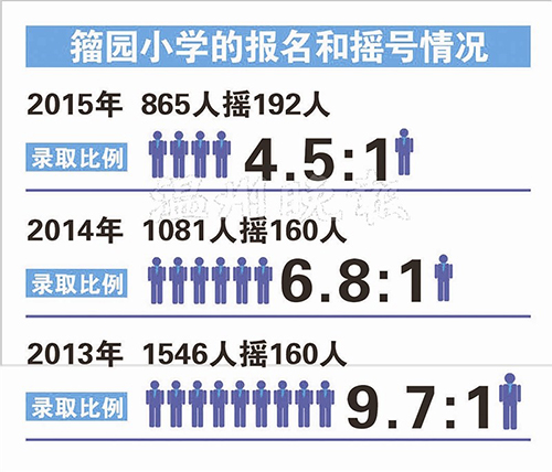 据了解,2013年籀园小学的报名和摇号情况为在1546人中摇160人,录取比例为9.7:1; 2014年在1081人中摇160人,录取比例为6.8:1。从今年籀园小学的在865人中摇192人,录取比例4.5:1的数据中可以看出,报名参与摇号的人数呈明显下降趋势,这也说明了家长对于籀园这类名校的热衷程度有所降温。