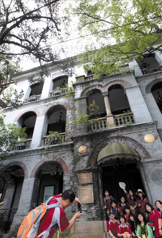 7月14日,一些游客正在英国驻温州领事馆旧址前拍照留念。