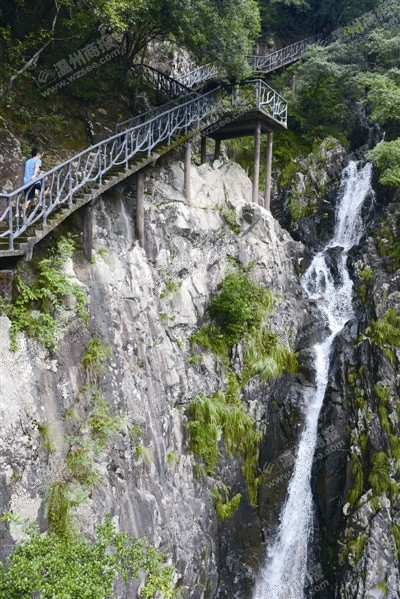 到达青龙谷谷底的栈道平台,前方的视野豁然开朗,山谷中飞奔而下的瀑布,因为谷底太深,无法目测它的高度。而在飞虹亭,这里的瀑布很亲民,从20多米高处如同天女散花四处漂移,十几米之远,水花很调皮地“钻”入怀中,不禁让人打冷战。