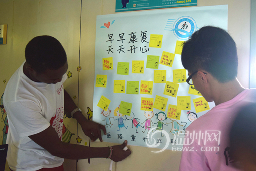 来自肯尼亚的留学生Yiwa和孩子们一起给病房换“新”,将社区健康儿童写的祝福语张贴在病房里