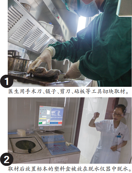 病理科的巨检室(巨检就是肉眼大体看一下切下来的标本是什么样子,量一下大小等)就在病理检验中心进门第一个办公室,制作标本的第一道工序——取材就在这里进行。手术刀、镊子、剪刀、砧板……这些设备宛如厨房用具。每份人体组织经过当班医生肉眼观察,寻找可能病变的部分,再切下一小块,放在一个白色塑料盒子上,一名病理技师配合着做了登记。医生说,200多份人体组织基本要切一上午的时间。