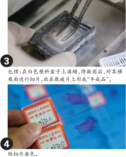 取材之后,这些白色塑料盒子要先进行脱水,放在一部脱水仪器中脱水一晚上。第二天一大早,会有一名病理技师负责用包埋机对这些组织切块进行包埋。简单地说,就是用石蜡包裹,两个多小时凝固后,对其横截面进行切片,放在载玻片上形成“半成品”。