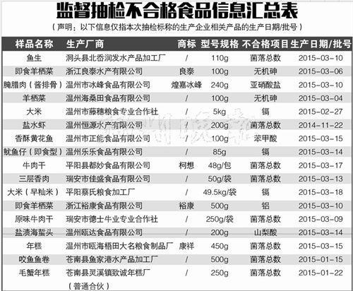 17批次的食品都有哪些问题?记者看到,问题出现最多的是一项微生物指标——菌落总数超标,分别是鱼生、盐水虾、牛肉干、香肉、鱼卷和年糕等;其次,是重金属元素超标,其中,两批次羊栖菜无机砷超标,两批次大米和一批次的鱿鱼仔镉超标,还有一批次的羊栖菜铝含量超标。此外,还有腌腊肉、香酥黄花鱼、盐渍海蜇皮出现了亚硝酸盐、苯甲酸、山梨酸等添加剂指标超标。