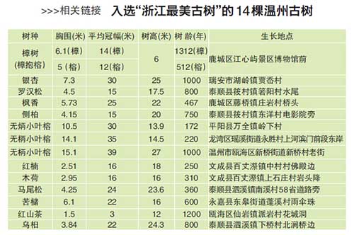 而入选的温州古树树龄跨度也较大。其中最年轻的是位于平阳万全镇岭下村的172岁的无柄小叶榕,最年长的则是位于江心屿景区博物馆前的樟抱榕中的樟树,有1312年的历史。而浙江最老古树则是位于丽水市莲都区联城街道路湾村的一棵古樟,有“浙江第一樟”之称,树龄达1700年。