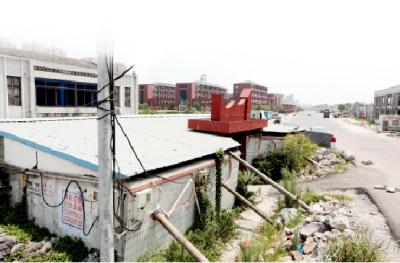 温州网乐清支站讯 从市区宁康西路拐向五环路,约1公里长的崭新道路已经建好,路面很宽,约30米。然而,就在离宁康西路的拐口不远处,五环路路面“缩水”了近半,四间一层高的铁皮顶棚房子横在了路上,来往车辆不得不迅速减速。