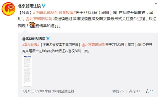 今日,据北京市朝阳区人民法院官方微博消息,北京朝阳法院将于7月23日上午9点,开庭审理汪峰诉韩炳江(卓伟)名誉权案。