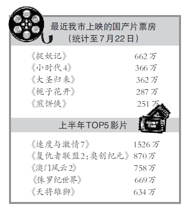 雁荡电影院线相关工作人员表示,《捉妖记》《大圣归来》《煎饼侠》等电影的观影热度还在持续,加上早先的《小时代4》《栀子花开》,今年7月虽是国产片当道,但表现均不俗,比进口片扎堆的时候还热闹许多。
