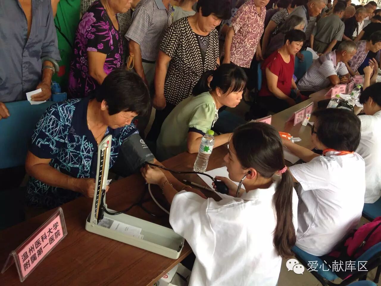 在黄坦镇镇广场,来自温州医科大学附属第一医院、温州医学院附属眼视光医院的医生们为300多位库区群众免费体检看病。量血压、测血糖、免费送药……面对排成长队的求诊群众,医生们一一作了耐心诊疗。在义诊现场,温州仁爱义工队的志愿者免费为库区群众提供理发、剪指甲、按摩等志愿服务。
