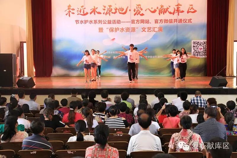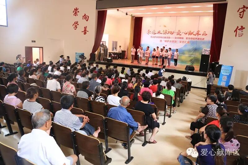 在黄坦镇文化大礼堂,嘉宾们与当地群众一起参加"亲近水源地 爱心献库区"节水护水系列公益活动官方网站、官方微信启动仪式,并观看由温州医科大学仁济学院全科暑期社会实践服务团带来的精彩文艺汇演。