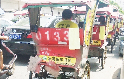 昨日,记者在市区丹阳路看到,七八辆人力三轮车停在市人民医院住院部门口,车后右侧都挂着一条黄色毛巾,原本印有5个数字的车牌号,最右边的数字刚好被垂下的毛巾挡住。