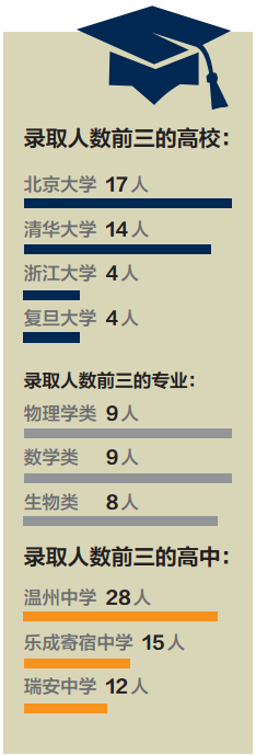 该名单显示,这68名学霸中,来自温州中学的学生共28人,约占四成。温州中学副校长金长林说,校方对今年自主招生的情况非常满意。今年全国各高校整体自主招生名额减少,学生从高中校内选拔转为直面高校筛选,难度加大。不过温中学生的优势还是很明显,这得益于学校从办学以来就注重学生全面素质培养。