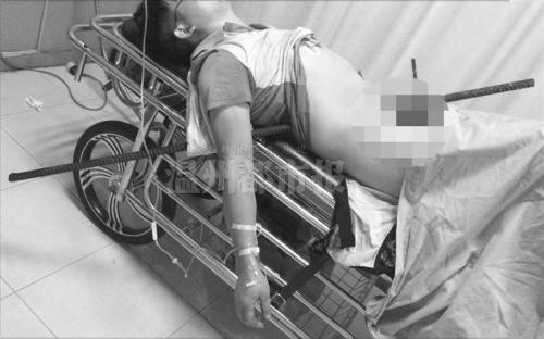 据工友介绍,昨天上午7时30分许,陈某从工地一处离地3米高的地方跌落,下方正好有一根长约1.5米、直径约2.5厘米的钢筋竖立着。钢筋从陈某肚脐眼下方插入,穿透腹部,从右侧后腰穿出(图①)。