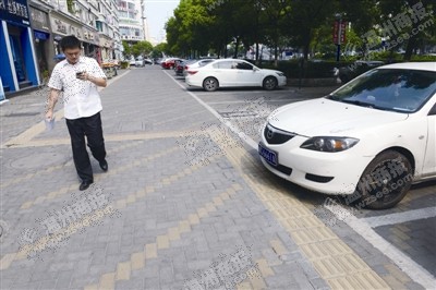 昨天,就在新乐大楼楼下,林达指着咪表附近的人行道引导记者看一个现象。原本笔直的盲道,在经过泊位时,线路突然拐弯。“现在设置咪表泊位的地方,原本是盲道,为了设置咪表,又不让盲道消失,在施工时,一段盲道被平行移了出来,形成一个弯曲的造型,而一些人行道泊位则紧邻着盲道,一旦有盲人路经此地,将有很大的安全隐患。”林达说。