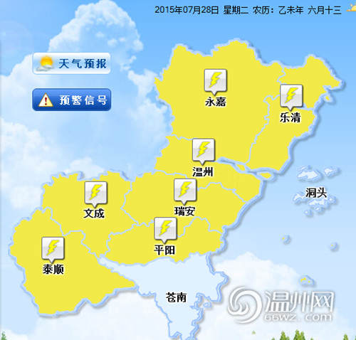 温州网7月28日快讯(记者 鲍苗苗)温州市气象台消息今天14时29分发布温州市区、瑞安、永嘉、文成、平阳、泰顺雷电黄色预警信号。