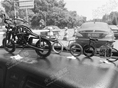 按照胡女士给的联系方式,记者找到了这位的哥古亚海,很难想象眼前这个五大三粗的汉子能做出那么精细的手工作品。古亚海四十开外,他的出租车与普通出租车无异,只是仪表台上摆了三架铁丝编制的模型,两辆自行车模型,还有一辆块头更大、工艺更精细的摩托车,小自行车的身上还挂着一个“出售”的牌子。