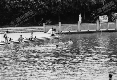 昨天下午3时许,记者来到动车站前的河岸边,只见河道内已有多名群众在此游泳,其中还有小孩。虽然在河道的两边也立着多个警示牌,上面写着“滑坡地带,小心落水”“水深危险,严禁下河嬉水”等,但这都阻止不了群众们的热情。一些游泳者直接在水中打起了“水仗”,几名小伙还玩起了“水中篮球”。