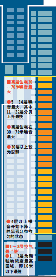 记者测试的结果与南京环保部门的测试比较接近。一般5楼以上,噪音分贝会随着楼层增高而变大,当楼层更高时,噪音又出现下降,5~24层噪音最大,噪音在11~22层上升最多,30层以上又较为安静。如果是1幢26层高的楼房,20~22层噪声最大。