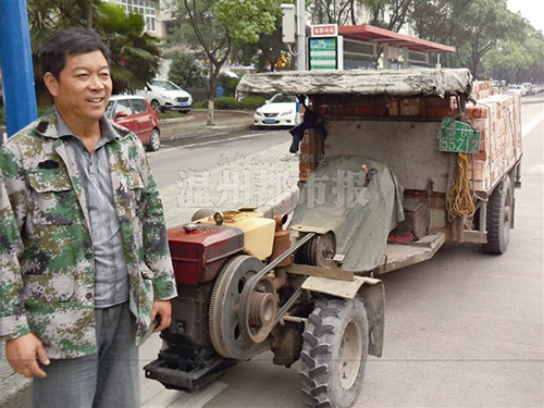 近日中午12时10分许,市交警一大队一中队组织警力,加强锦绣路严管街中午空档期间的管理。民警巡逻时发现,一辆平时只能在农耕地上见到的手扶拖拉机竟然在锦绣路上招摇过市。伴随着“轰隆隆”的马达声,这辆载满砖头的手扶拖拉机运行十分吃力,一路摇摇晃晃、颤颤巍巍地“爬驶”着,似乎随时会散架一样。民警当即将该车拦截下来。