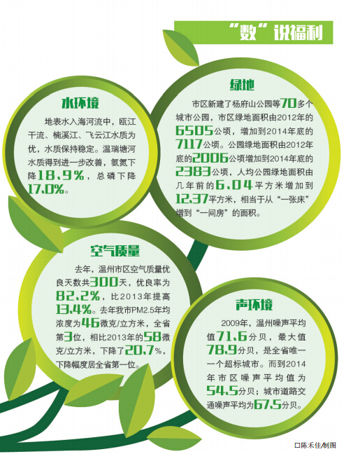 温州在赶超发展两年来,在城市环境建设方面力度很大,如“3+1”亮点区块和“四边三化”中的建设中绿化等项目,积极响应百姓的生活需求,大力改善市民的居住环境,提升了温州城市整体品位和档次。