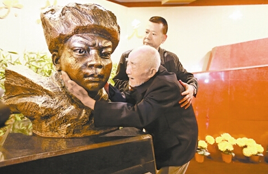 ↑李继德老人参观黄继光纪念馆,抚摸着黄继光雕像激动不已。特约记者孙绍建摄