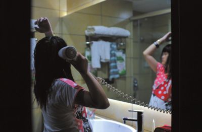 深圳一家宾馆内,很久都没能洗澡的思思终于洗了个热水澡,放松地为自己吹干头发。