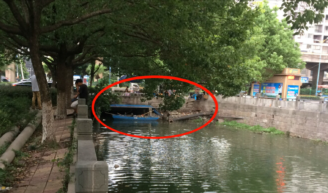 在卢先生的指引下,记者来到位于商城北侧的河边,河流为东西流向。“你看那个桥下,有一半的宽度被堵了,有次暴雨我就来河边看看到底是什么原因,一看,桥下堆了好多杂物,都是被冲过来的,河水很难流过去。”记者看到,河流的宽度目测约10米,但是到了东面的桥下,宽度突然变窄为原先的一半,有一半被石头、管子等堵住,另一半可供河水流过的宽度则停了一艘小船,据悉,这条小船是清理河面用的。