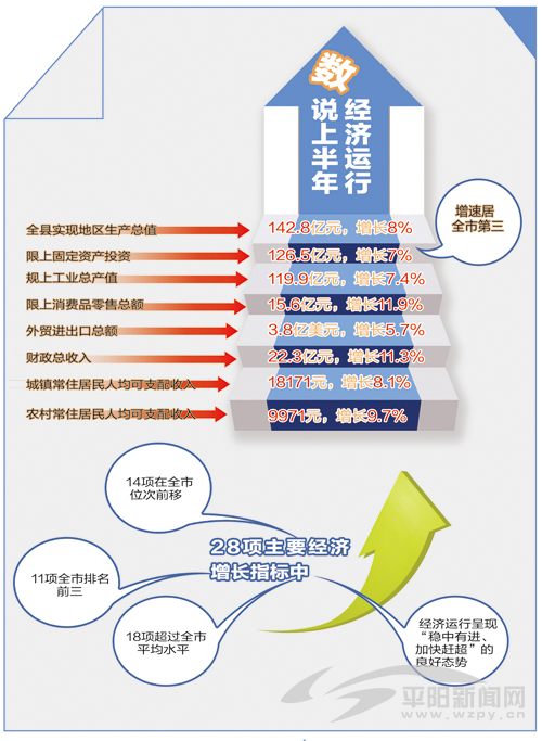 突出发展实体经济,制订出台系列政策,打好转型升级“组合拳”,经济运行呈现“稳中有进、加快赶超”的良好态势。上半年,全县实现地区生产总值142.8亿元,增长8%,增速居全市第三;限上固定资产投资126.5亿元,增长7%,其中工业性投资21.3亿元,增长35.5%、增速居全市第一;28项主要经济增长指标中,有18项超过全市平均水平,有11项全市排名前三。狠抓有效投资,首批19个总投资137亿元的重大项目集中开工,开展重点项目征迁“清零”百日攻坚行动,新增省重点建设项目5个、居全市第一;加快推进50个“机器换人”示范项目,完成技改投资15.1亿元,增长58.4%。重抓科技创新,组建招才局,谋划建设省级(重点)企业研究院,县政府与中国计量学院全面开展科技合作,启明新材料公司与中科院宁材所成功组建BOPP技术工程中心。大力发展总部经济和推进企业上市(挂牌)工作,金世界公司总部成功回归,完成股改企业3家,佩蒂股份、依特诺登陆新三板,全市第一支投资新三板私募基金温州新拓在平阳成立。大力发展以电子商务为重点的网络经济,卓讯电商城开业,阿里巴巴村淘项目成功启动。大力推进“平商回归”,召开首届世界平阳人大会,实现省外回归引进项目到位资金24亿元、市外房地产项目到位资金26亿元。