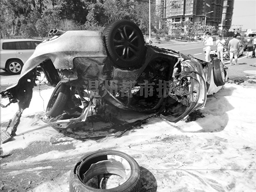 温州网讯 昨天下午2时30分许,温州市区牛山新路靠近沙门路口发生了一起自燃事故,奥迪车碰撞路边电线杆翻车后自燃,随后消防官兵赶到现场将大火扑灭,事故并未造成人员伤亡,但这辆价值90多万元的新车却已被烧焦(如图)。
