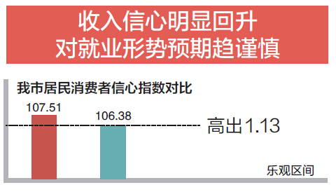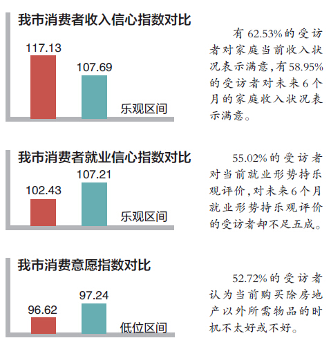 从收入、就业和消费意愿三大指标来看,今年上半年我市居民消费者信心指数的提升得益于收入信心的明显回升。事实上,今年上半年我市居民的就业信心和消费意愿较去年下半年均小幅下滑,消费者对就业形势预期趋向谨慎。工作人员分析,物价通胀及就业信心的下降对消费者的消费动力有一定影响。