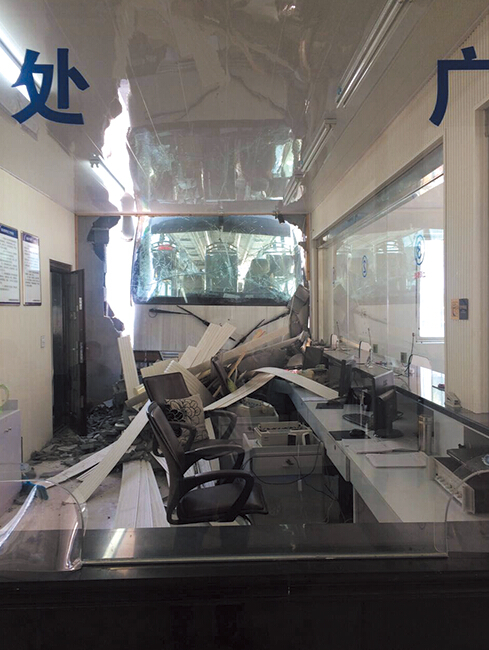 从现场照片上来看,被撞的售票大厅内一片狼藉,到处散落水泥砖块,肇事的大巴车前挡风玻璃在碰撞时发生碎裂,原本悬挂在墙体上的一台空调外机也遭了殃。