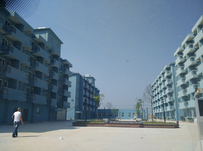 这是4幢蓝色房子,位于莘塍工业区东二路附近,两幢5层,两幢6层,外表整洁大气,很是吸引眼球。总占地面积15亩,2楼以上(含)共有396间,每间28平方米,可满足1000余名租房人员的居住需求。