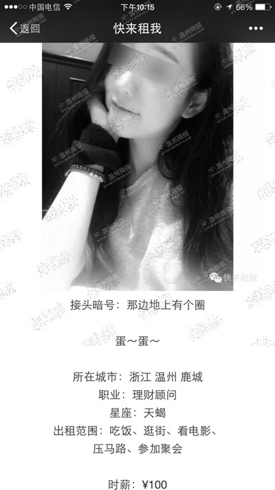 温州网讯 “七夕没人陪?快来租个妹子过节最靠谱!”从上周日开始,不少人的微信朋友圈被标题为“温州丨本周可出租的妹子”的文章刷屏,截至昨天下午阅读量已经接近4万。文章中贴出了10个号称温州本地的“妹子”信息,每个都有相应编号、个人照片,并显示所在地区、职业、星座,并注明了他们的出租范围、档期、定价等。假设每10人中有1人想约这些妹子,配比率也是1:4000,轮到的机会相当渺茫,但仍有人表示想试一试,但这样的“约会”方式真的靠谱吗?