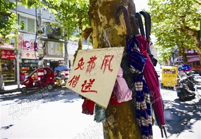 这个爱心赠伞点是一个多月前出现的,当时大树上挂出了数把雨伞,有短柄,也有长柄,看起来都不是很新,但是撑开了都还能用。边上还挂着一块手写着五个大红字“免费用借送”的牌子。于是,一到下雨天,路过没带伞的市民都会拿一把用。雨后,树上的雨伞总会少几把,但没过多久,大树的挂钩上就又会挂出几把。