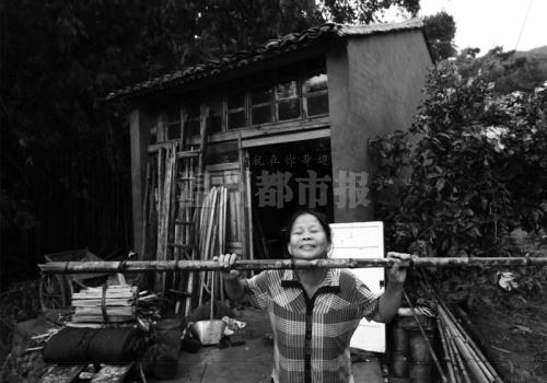 ▲“我当时就是这样让自己浮起来的。”昨天,吴银干的老伴拿着一根竹竿比划着。
