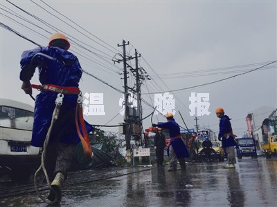 昨天凌晨5点,风雨相对减弱,温州供电公司全面启动电网设施抢修和供电恢复工作,迅速集结抢修力量,组建电力应急抢修队伍155支近2000人,奔赴各受灾现场,全力抢修。