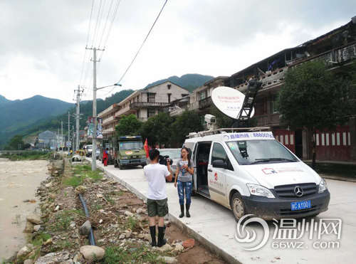 为了近距离报道最新灾情,我和我的伙伴们驾驶温州网卫星直播车赶往台风重灾区平阳。在平阳麻步镇岙底村,我们看到道路积水十分严重,水位高,车辆根本无法前进。媒体记者,救灾队伍,车辆等都等候于此,等水散去。