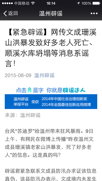 这里要提下我们可爱的辟谣妹子。当台风期间,“平阳县顺溪水库坍塌”等各种不实信息在微信朋友圈里快速蔓延,闹得人心惶惶时,90后妹子勇挑重任,及时向市水利局、平阳县防汛办、文成县防汛办等当地政府部门求证核实,并通过“温州辟谣”第一时间辟谣,以正视听。此举也得到市防汛办领导的肯定:很好很及时。