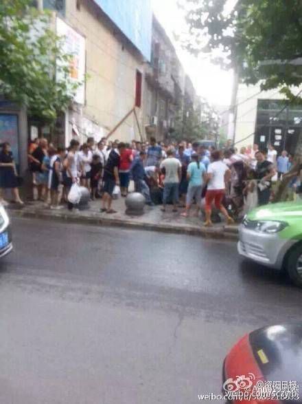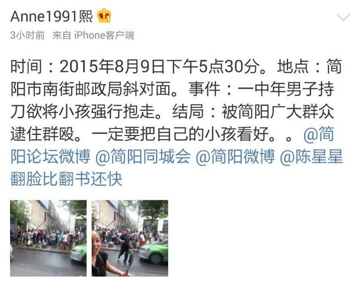 微博称:“时间:2015年8月9日下午5点30分。地点:简阳市南街邮政局斜对面。事件:一中年男子持刀欲将小孩强行抱走。结果:被简阳广大群众逮住群殴。一定要把自己的小孩看好。”