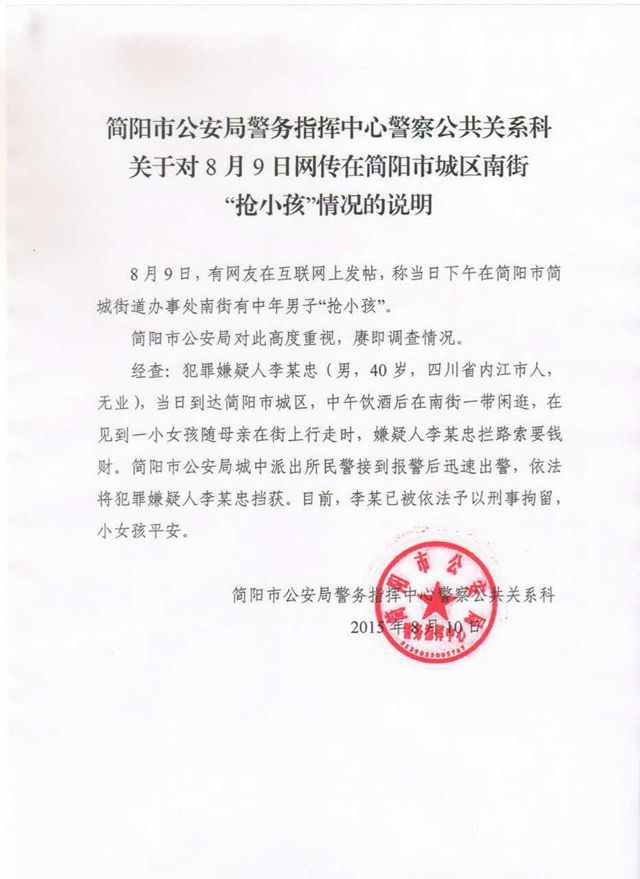 通报称,8月9日,有网友在互联网上发帖,称当日下午在简阳市简城街道办事处南街有中年男子“抢小孩”。简阳市公安局对此高度重视,赓即调查情况。经查:犯罪嫌疑人李某忠(男,40岁,四川省内江市人,无业),当日到达简阳市城区,中午饮酒后在南街一带闲逛,在见到一小女孩随母亲在街上行走时,嫌疑人李某忠 拦路索要钱财。简阳市公安局城中派出所民警接到报警后迅速出警,依法将犯罪嫌疑人李某忠挡获。目前,李某已被依法予以刑事拘留,小女孩平安。