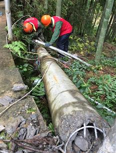 昨日,在湖岭镇芳庄娄山村,瑞安市供电服务队的党员们完成被大树压断的水泥电线杆抢修工作。据悉,“苏迪罗”造成湖岭山区多处电线杆被倒塌的树木压断,电力公司工作人员逐步对倒杆进行维修或更换。